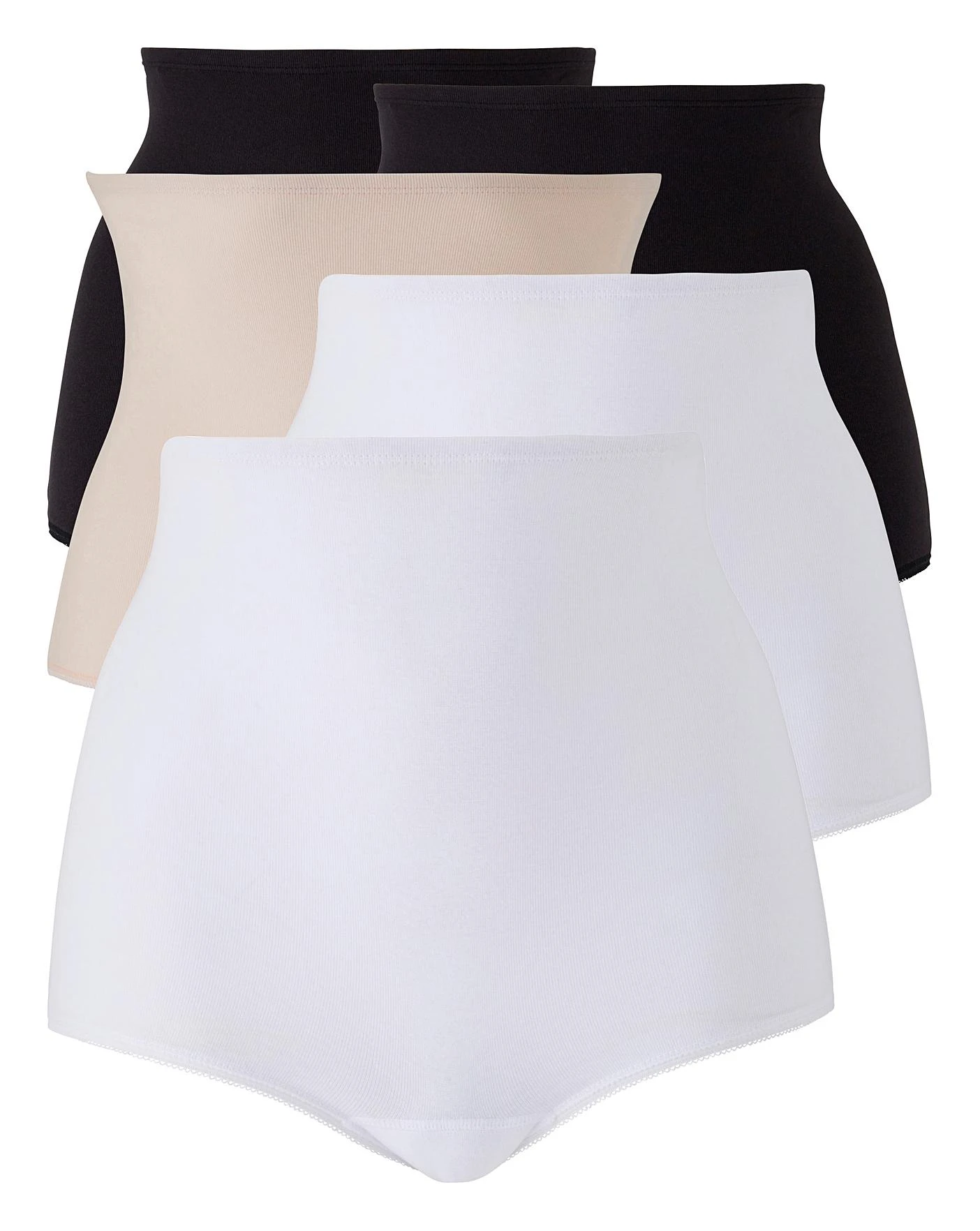 Designed to provide maximum comfort, our pack of 5 shorts feature a flattering, high-waisted design that effortlessly accentuates your curves, together with full-bottom coverage. Perfect for everyday wear, these shorts are made from 100% cotton, providing a lovely, soft feeling against the skin. Includes 1 blush, 2 black and 2 white.