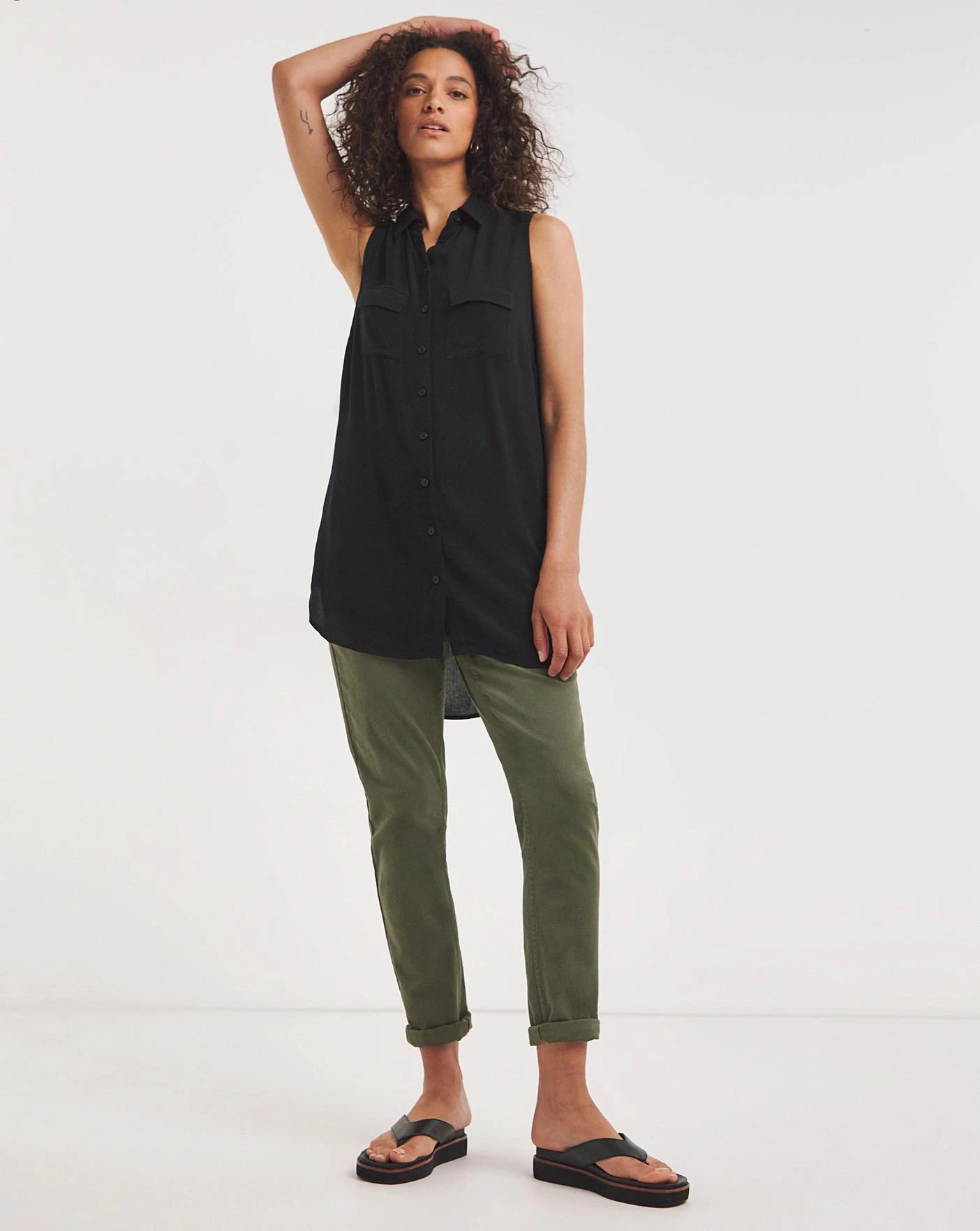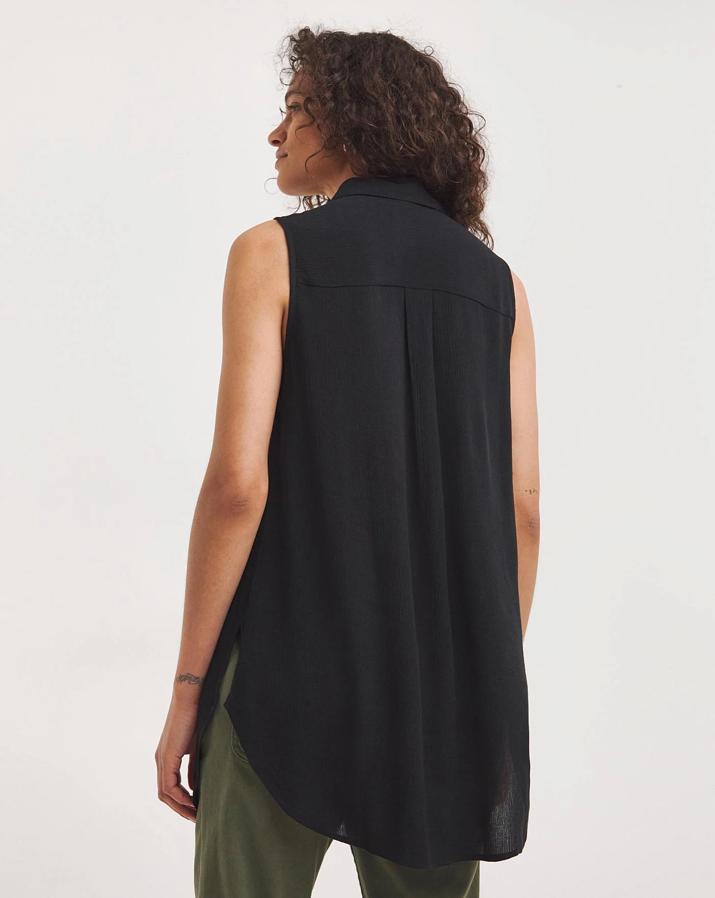 Look effortlessly stylish in our dipped back shirt in core Black. In 100% non-stretch viscose, this midweight viscose is soft on the skin and can be easily tucked into jeans for a chic look.