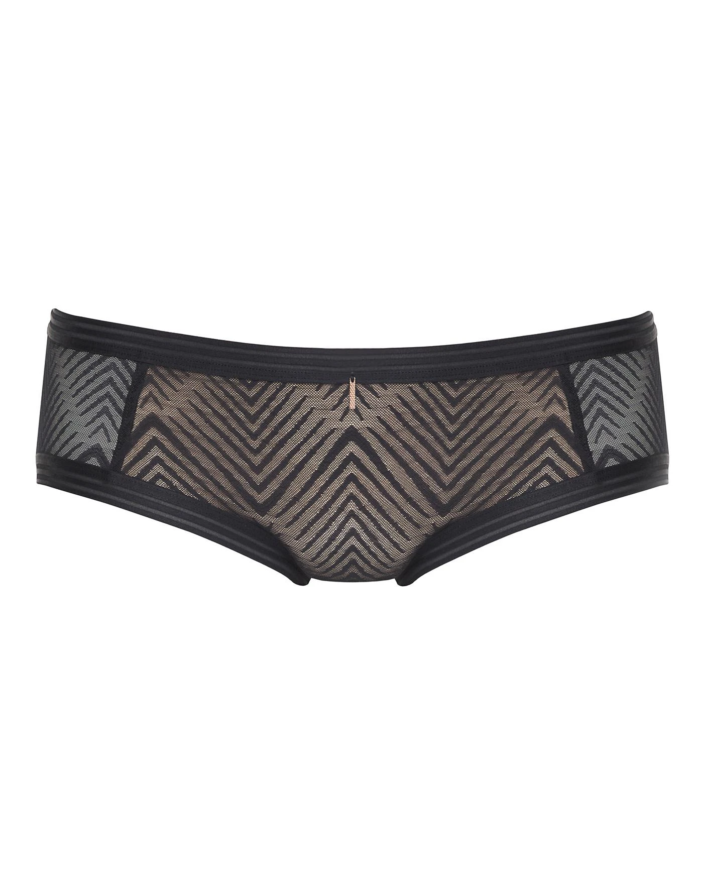 Tailored features a contemporary styling thanks to the geometric mesh lace overlay, teamed with either a tonal or contrast base. The short has a stretch geo-lace front with light lining for modesty. Flat shadow striped elastic at waist and legs. Rose gold bar trim at centre front.