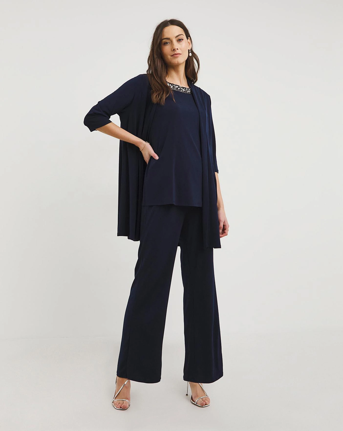This fabulous Joanna Hope 3-piece trouser set is the perfect new addition to your upcoming occasions. In a flattering premium jersey fabric, this three-piece trouser set comprises of jacket, vest and trousers in a stunning dark navy shade.