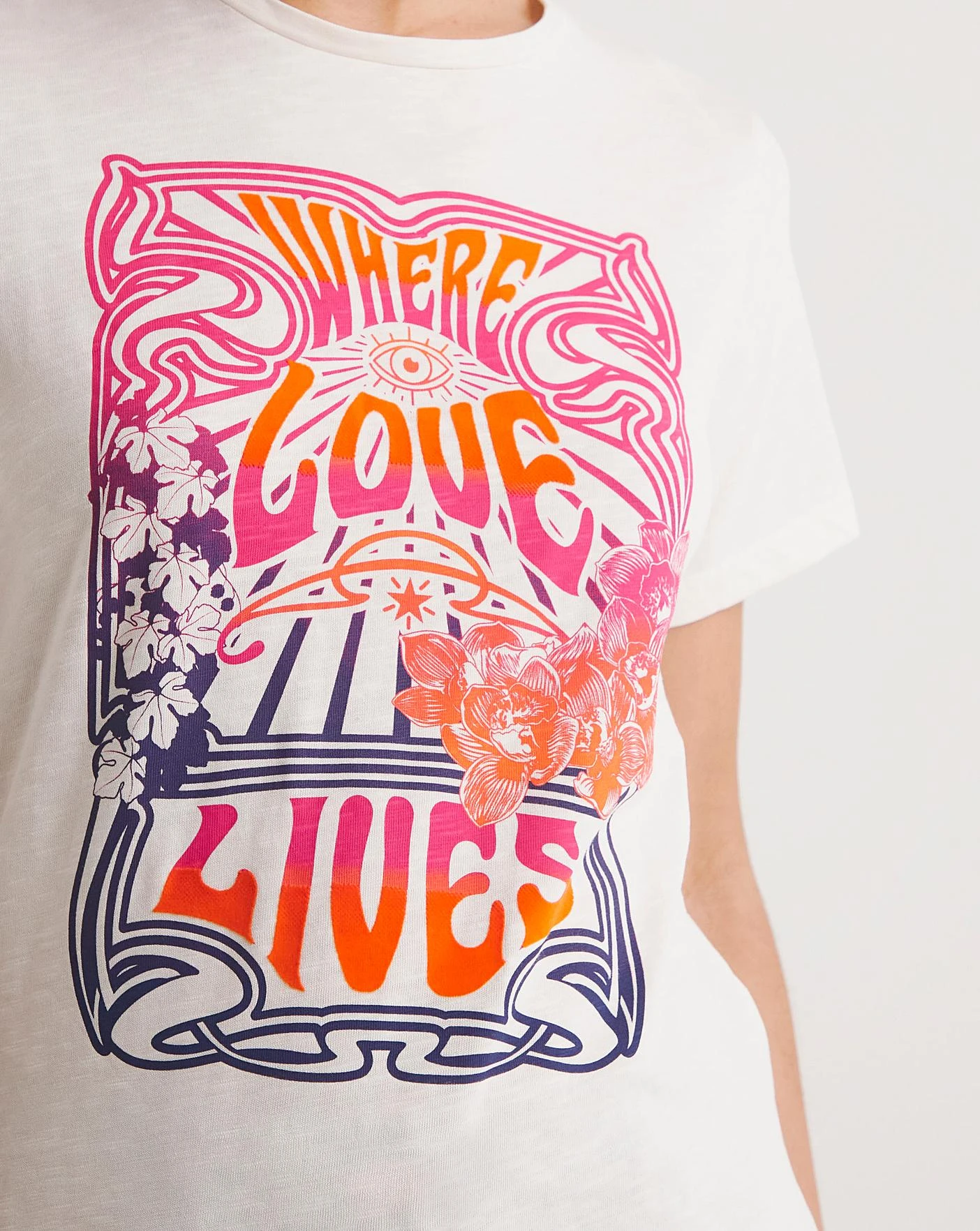 You’ll really feel the love in this fun jersey women’s tee. Featuring bold colours and a bold 70’s print that makes it stand out with a flattering fit.