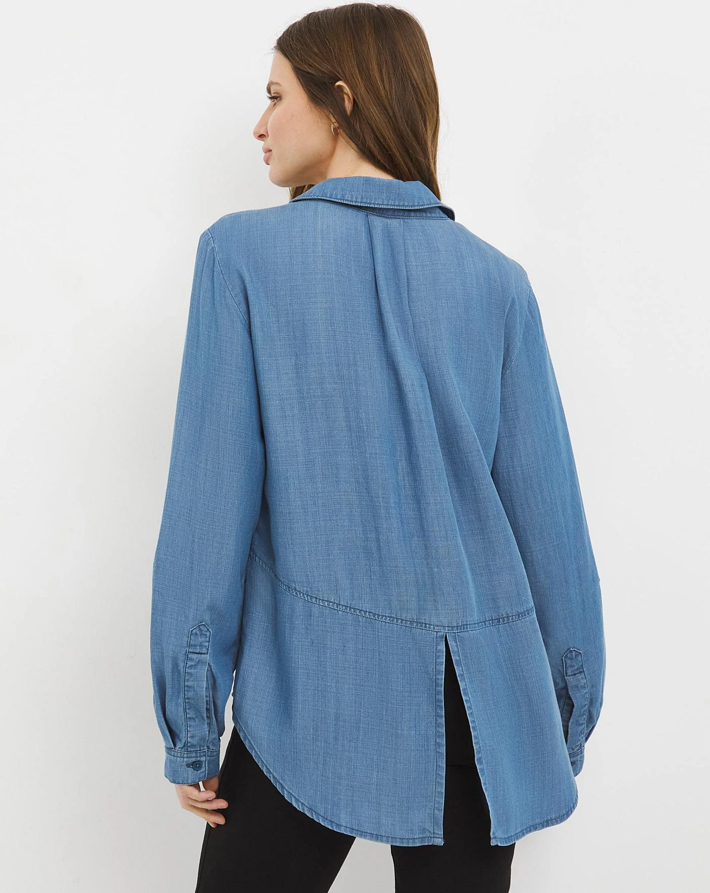 Adorned in a soft, denim effect fabric this blouse is an easy to wear everyday piece. Featuring a button down V neckline and three quarter length sleeves.