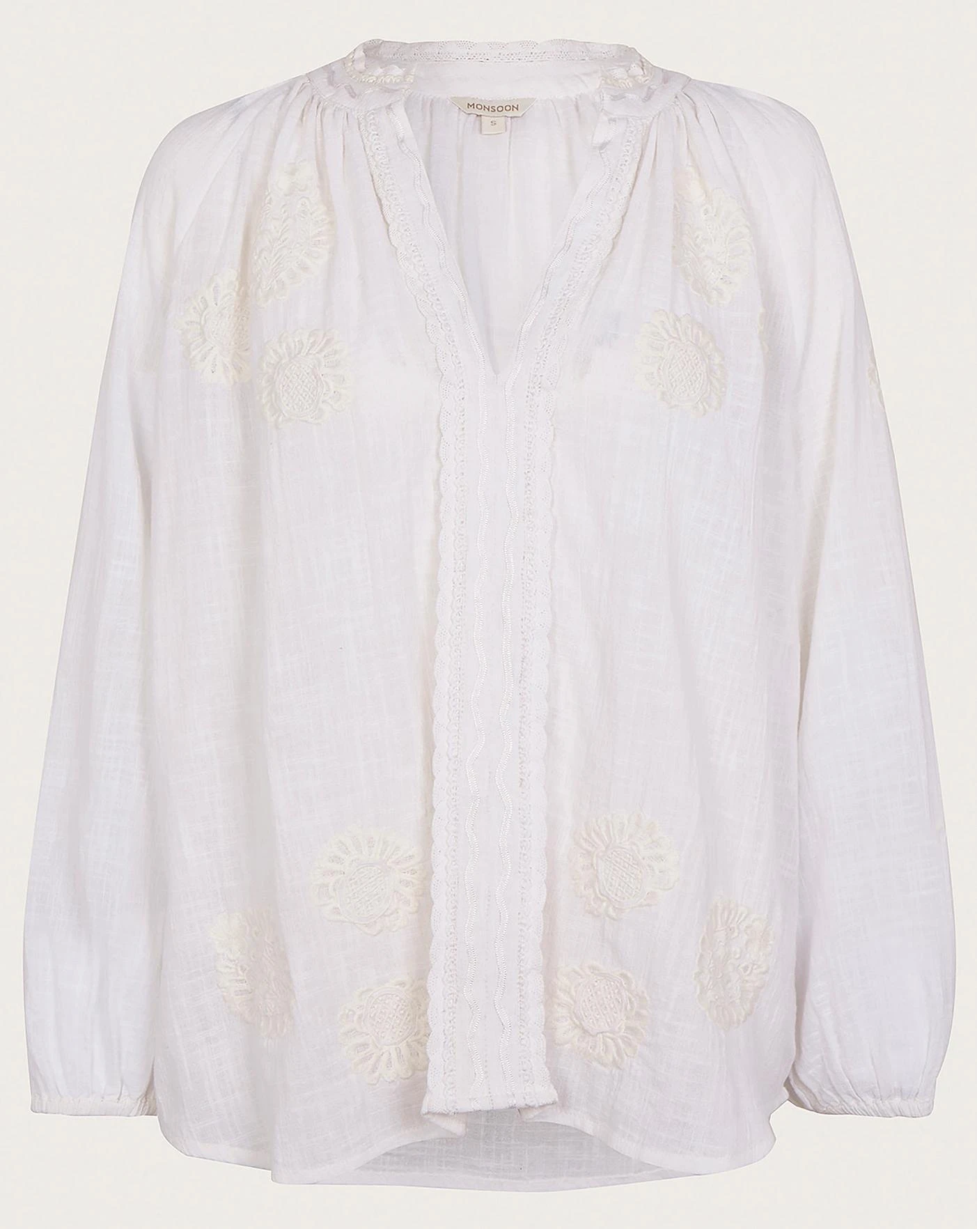 - Accented with embroidery throughout, this overhead shirt combines a relaxed fit with an elevated feel. Designed with a v-neckline, the blouson sleeves keep things airy whilst the frill neckline adds a touch of femininity. Designed in better-sourced cotton.As part of the journey to make our clothes kinder to the world around us, this item was made using more sustainable raw materials, such as organic cotton, recycled polyester and viscose from responsibly grown forests.
