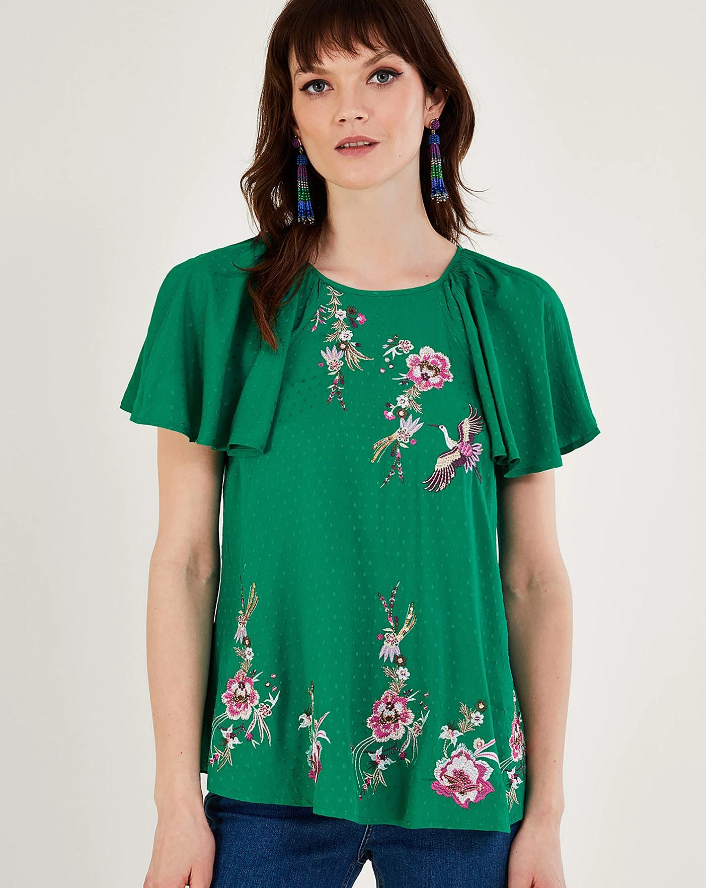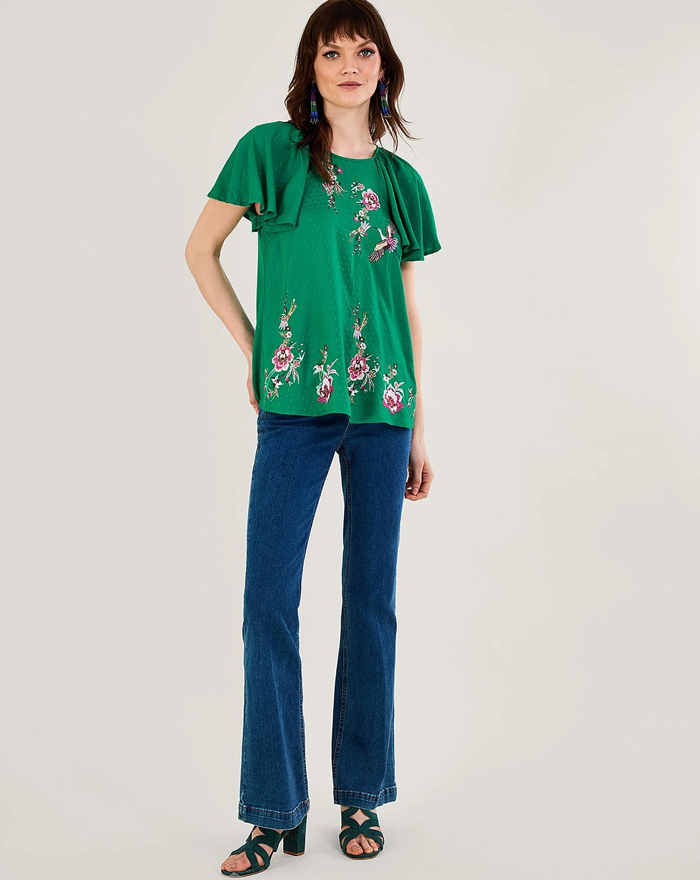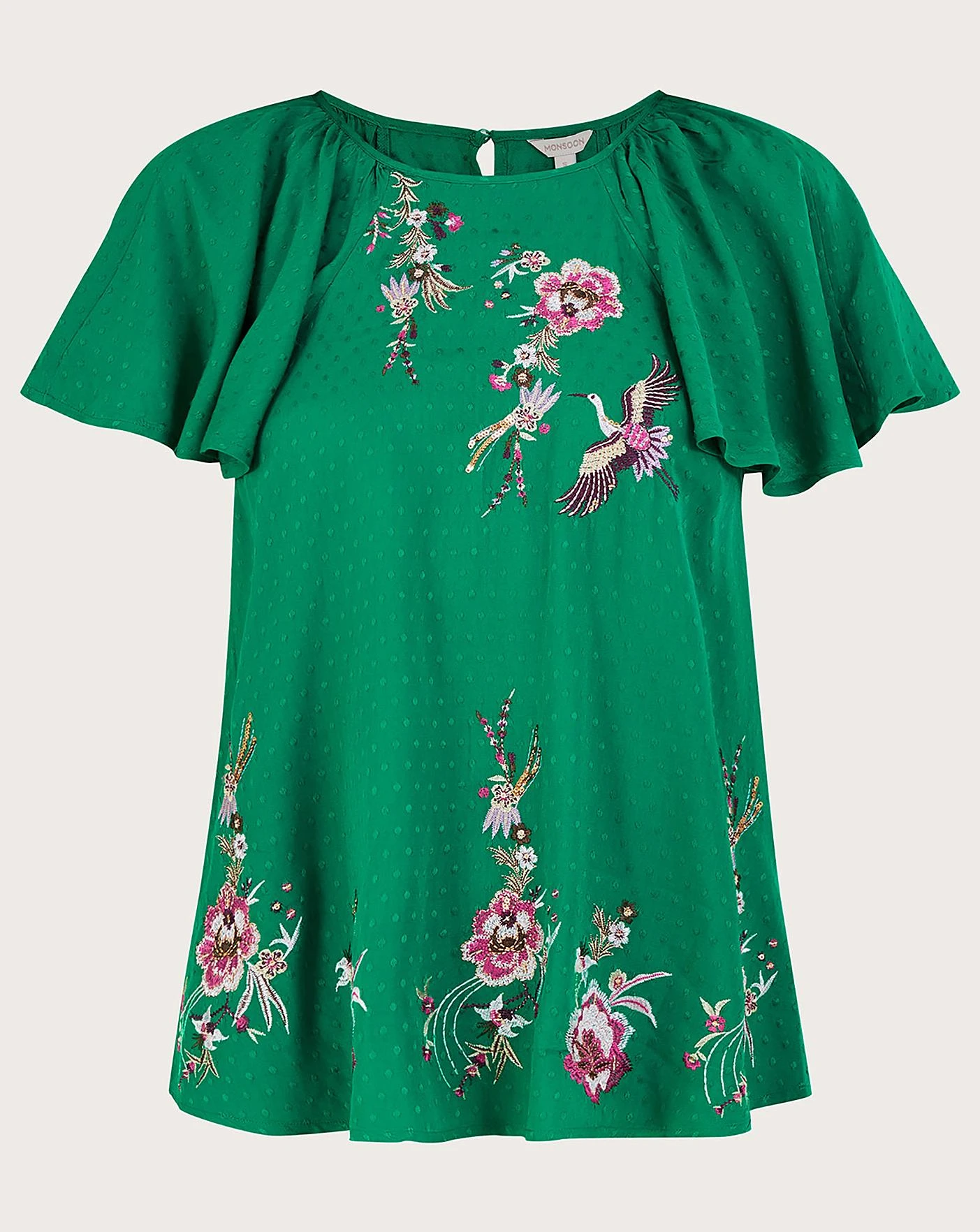 - An elevated tee for your edit, Jenny’s angelic silhouette is easy to slip on with jeans and boots for dinner settings. Embellished with teeny sequins, it’s embroidered with birds and botanicals through the relaxed fit and round neck, before fastening on the back with a keyhole button. Designed in floaty green viscose, find soft texture in the dobby fabric and ruffled flutter sleeves.