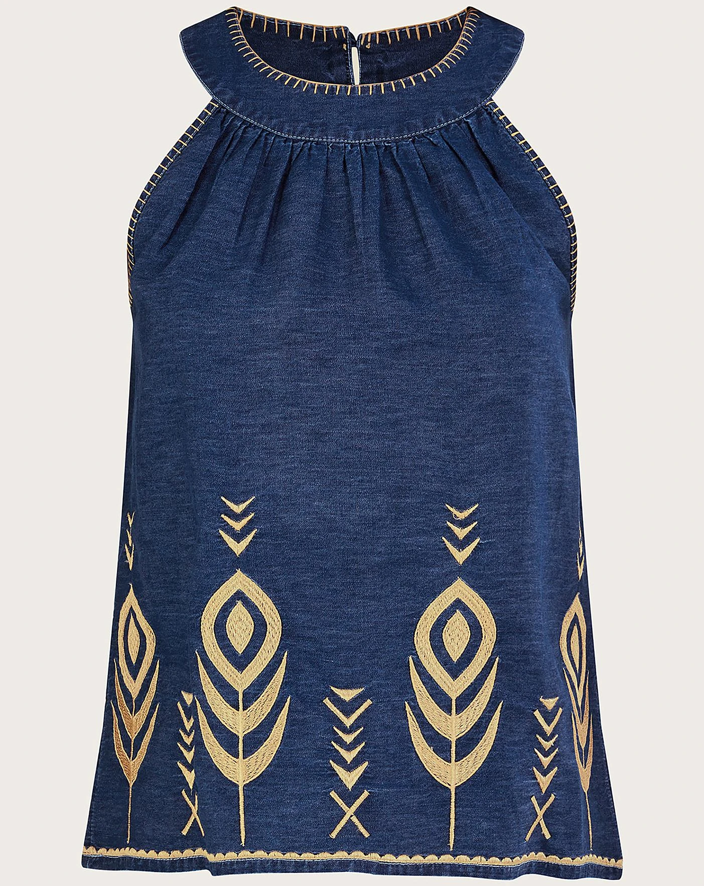 - Follow peacock feather embroidery through the hem of this tank top, standing out wonderfully against the darker wash. A lighter style of denim, the chambray fabrication is spun in breathable, better-sourced cotton with a sleeveless A-line profile to keep you cool on summer evenings. Fastens on the back of the neck with a keyhole button. As part of the journey to make our clothes kinder to the world around us, this item was made using more sustainable raw materials, such as organic cotton, recycled polyester and viscose from responsibly grown forests.