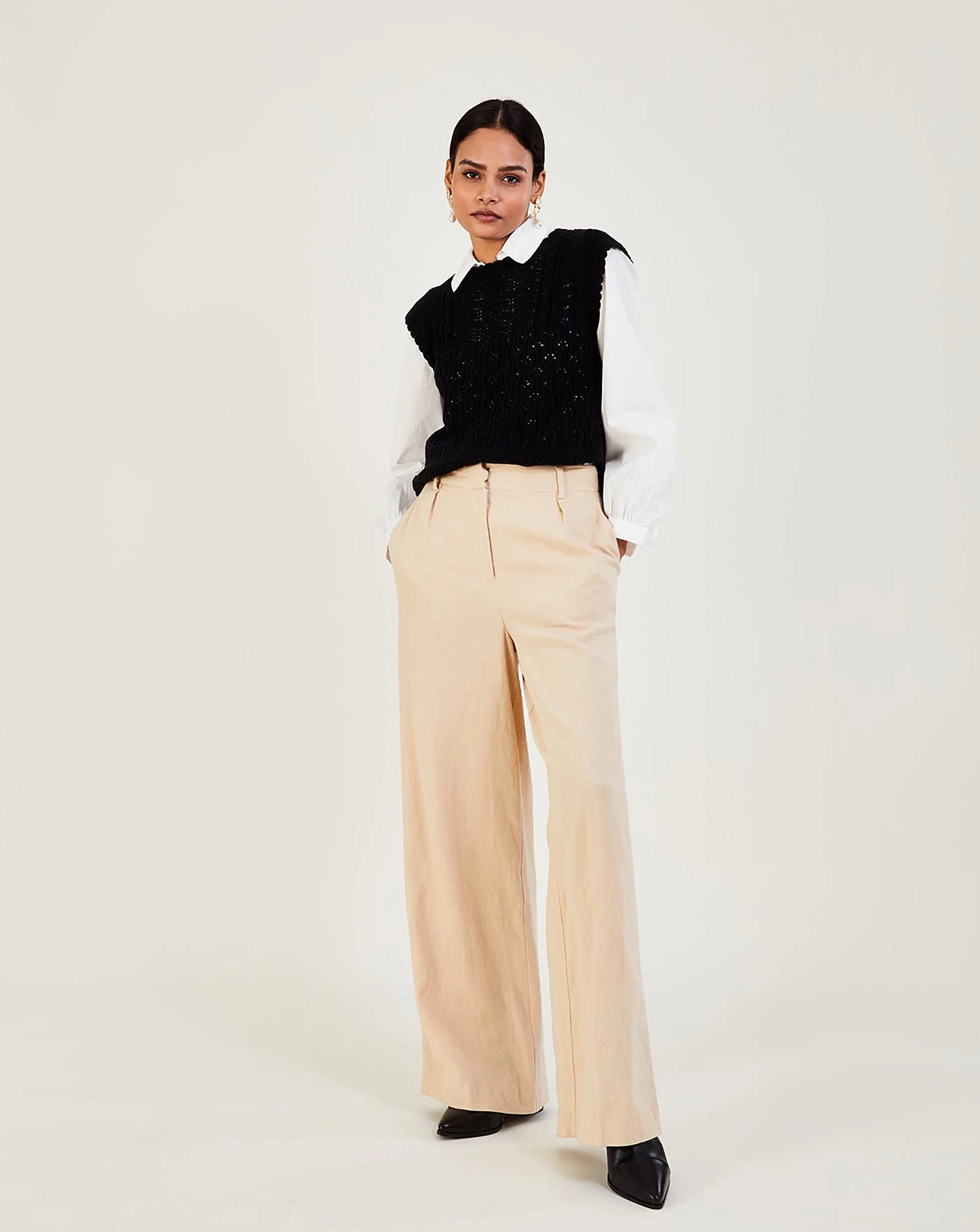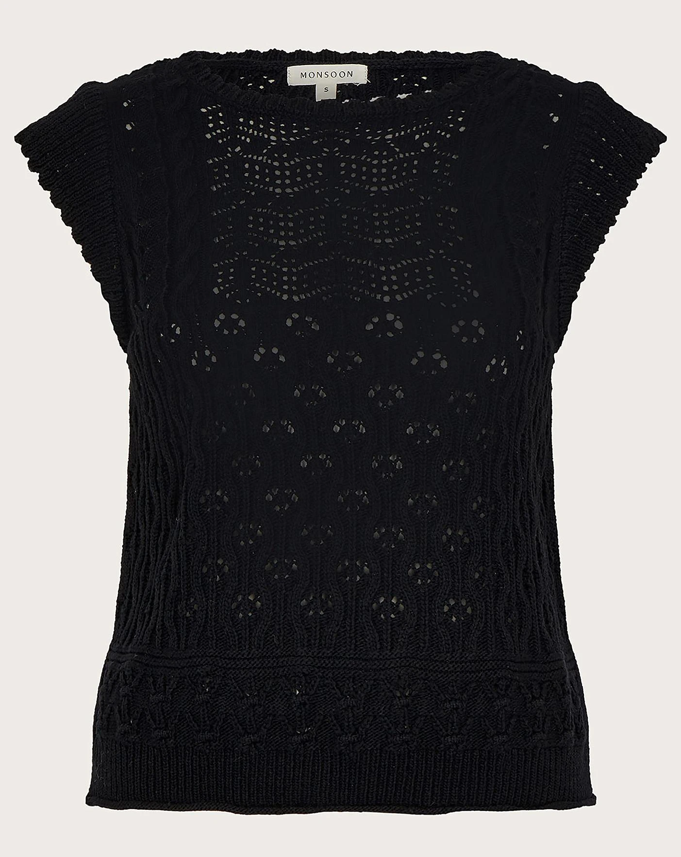 - Cosy textures: built with pointelle stitching, this knit vest is the perfect layer for those in-between days. Finished with a scallop trim, it features a round neck, sleeveless profile and small slits to the hem for free movement. We recommend styling it over a collared shirt or blouse for the perfect blend of cosy and smart. As part of the journey to make our clothes kinder to the world around us, this item was made using more sustainable raw materials, such as organic cotton, recycled polyester and viscose from responsibly grown forests.