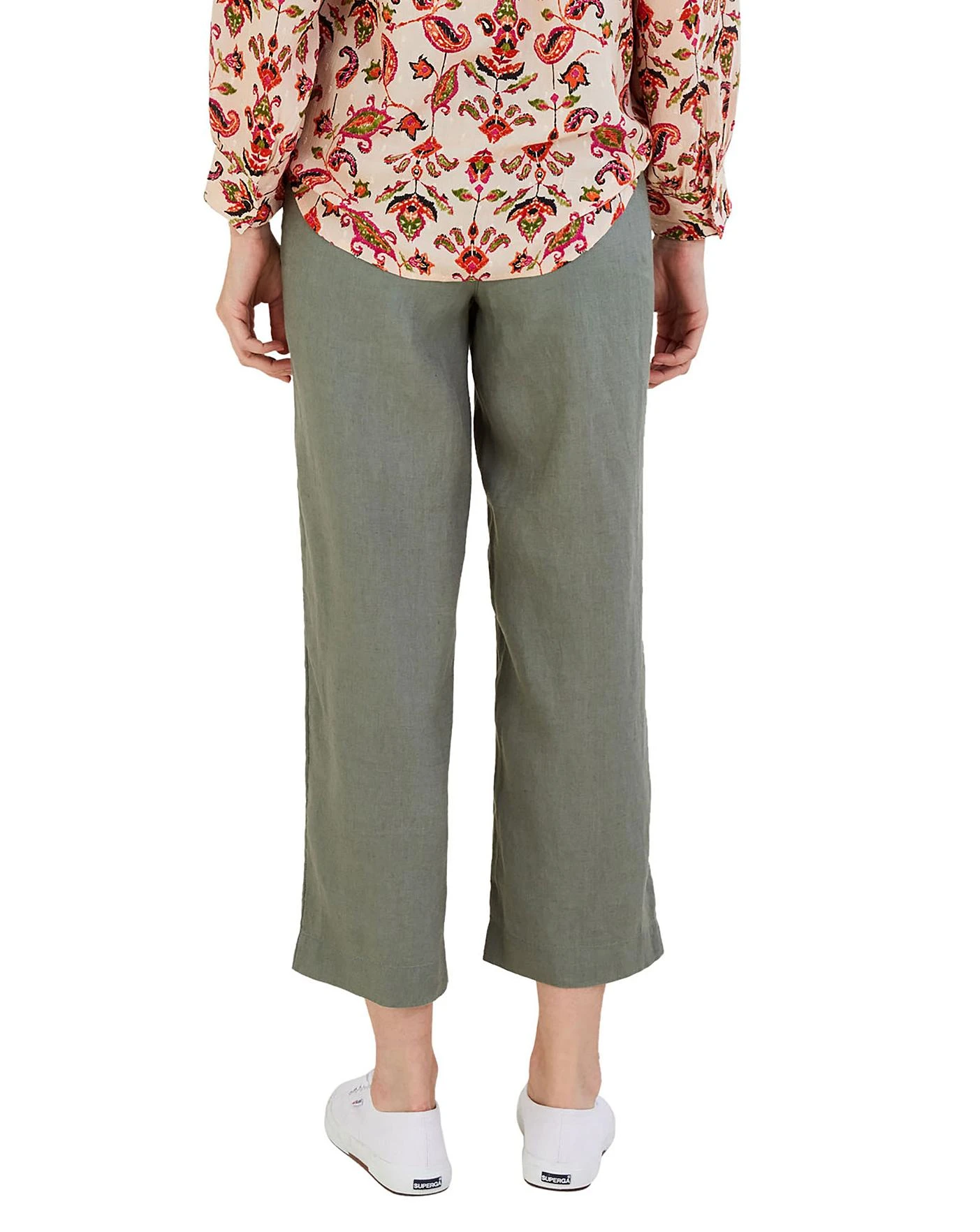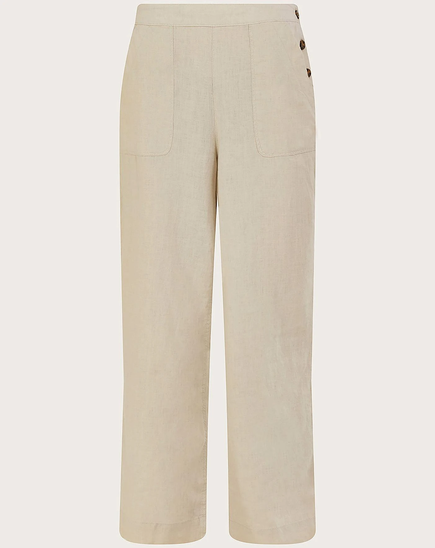 - Flattering to every shape, these lightweight trousers sit slim on the waistband and flare into a wide fit through the legs, with button detailing to the waist. Slightly cropped, you can style them with trainers or sandals, with pockets to the front for a practical finish. Spun in a lightweight linen blend.