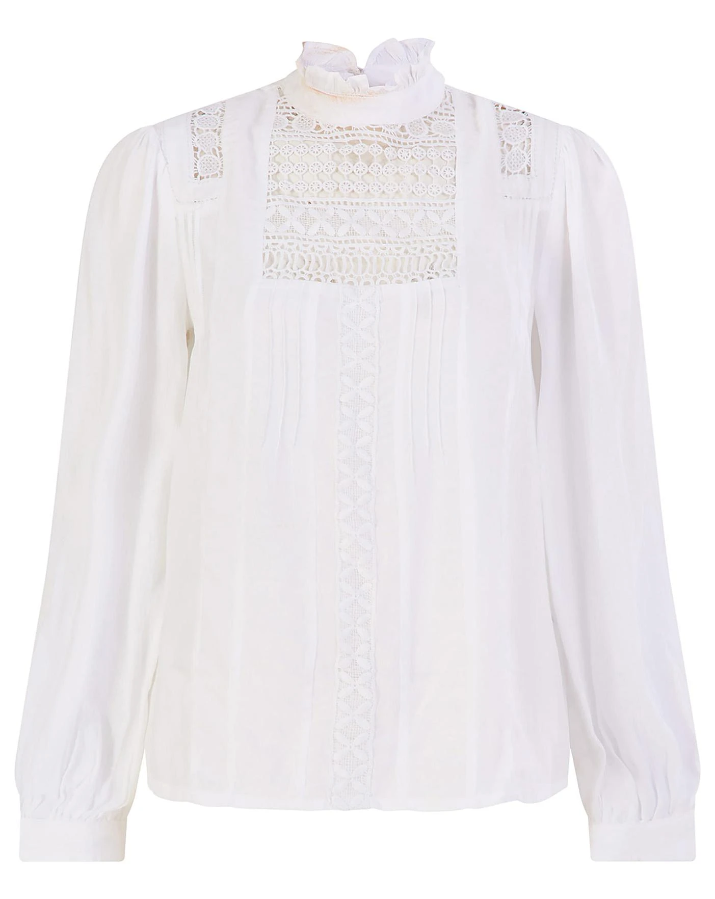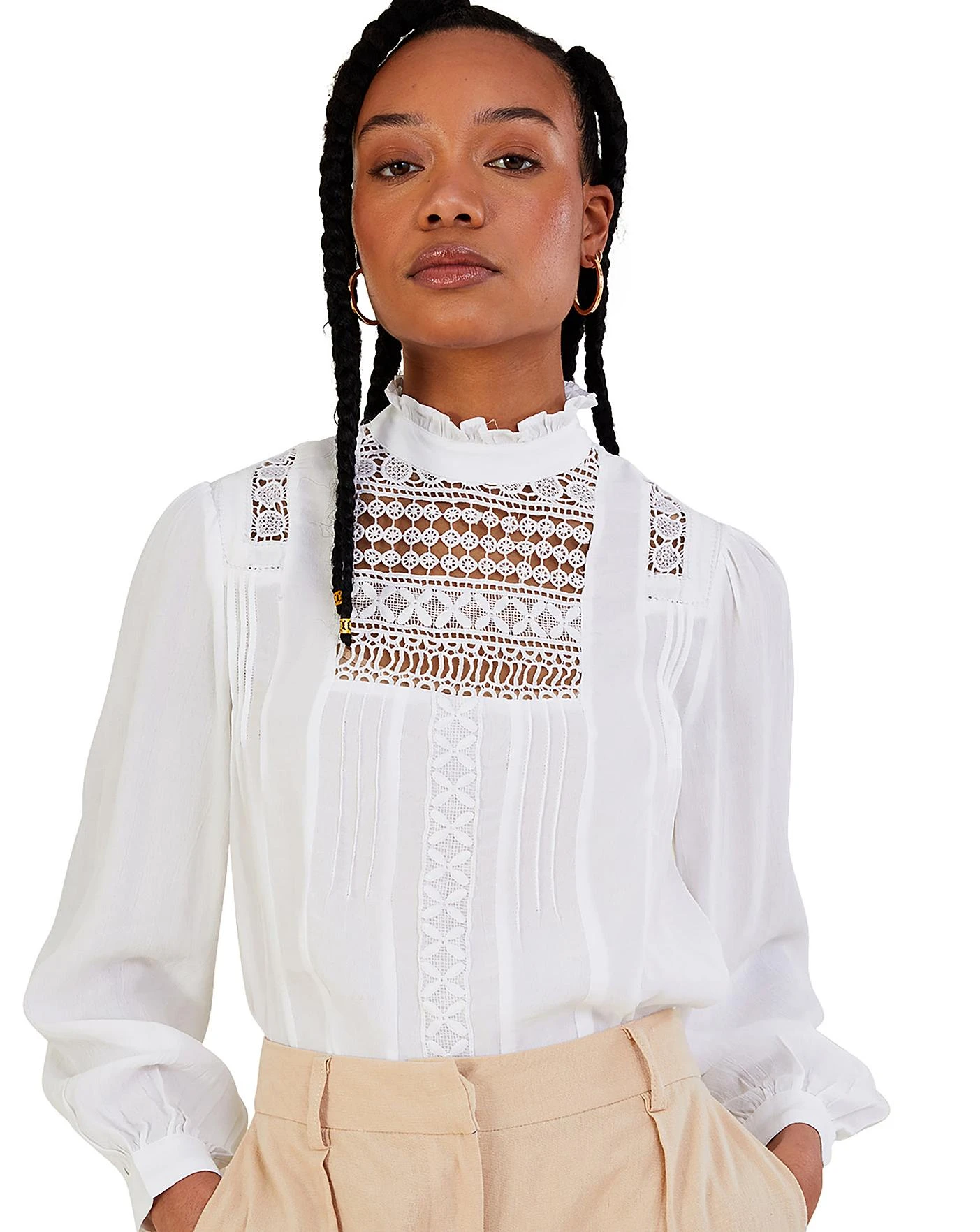 - Pretty frills and delicate lace: our Victoriana blouse is perfect to take into the office. Its high neck and relaxed silhouette creates a delicate shape, whilst the ivory backdrop and lace panelling to the front adds a feminine edge. As part of the journey to make our clothes kinder to the world around us, this item was made using more sustainable raw materials, such as organic cotton, recycled polyester and viscose from responsibly grown forests.