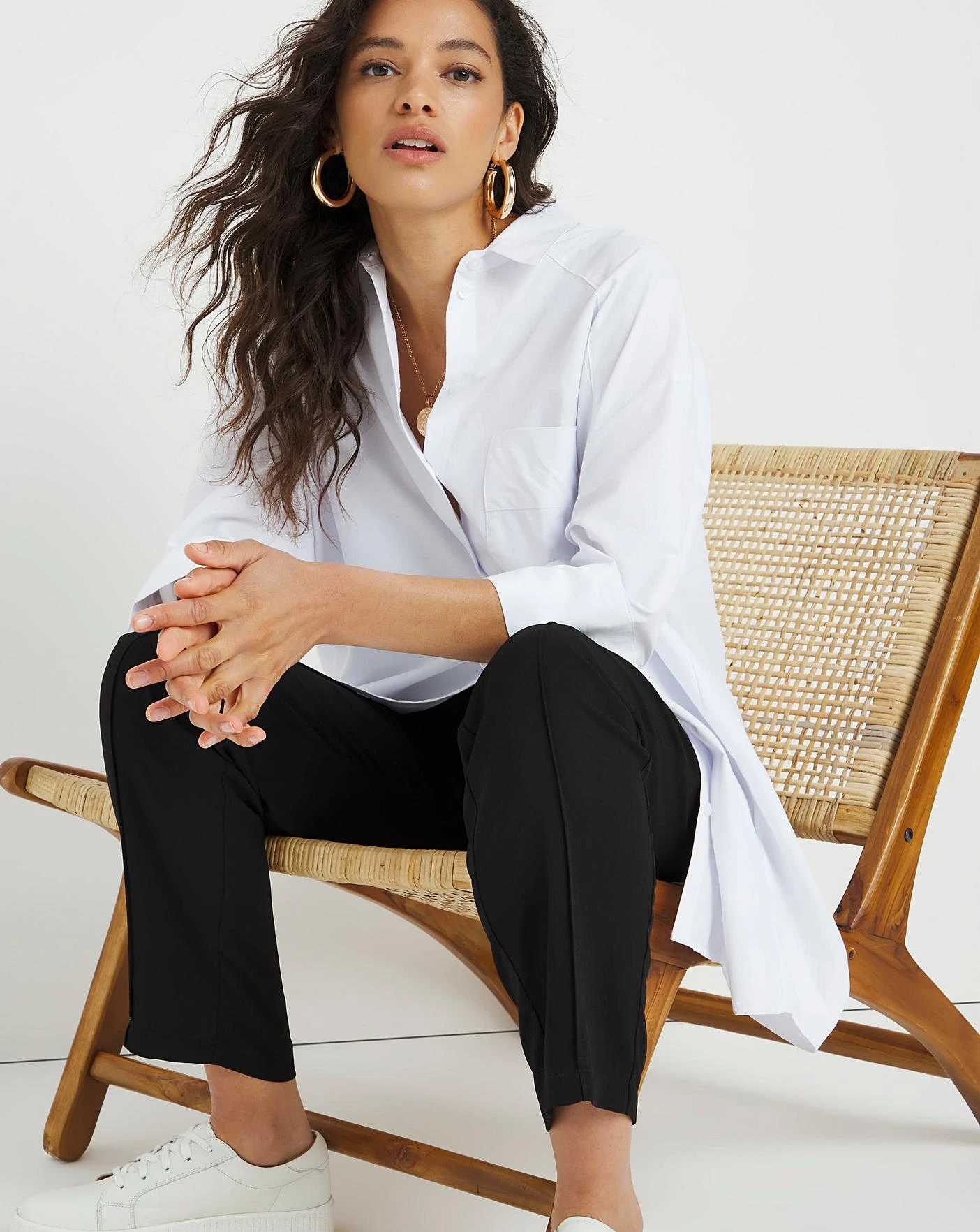 This pull on trouser is designed to sit high on your waist and fall to a tapered, ankle grazing hem. Elasticated waist for comfort. Toughen up your everyday look with a leather jacket and pumps.